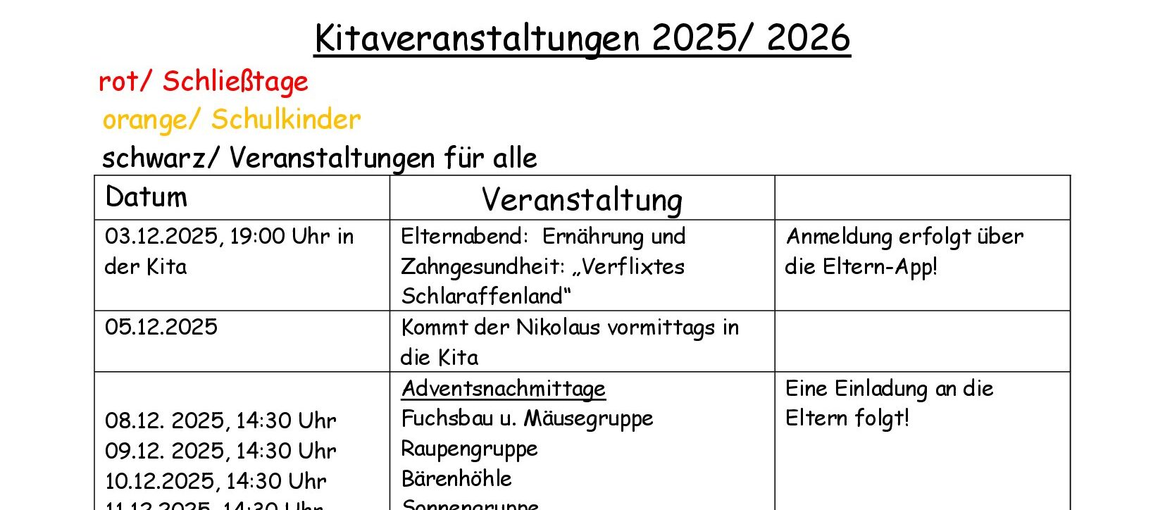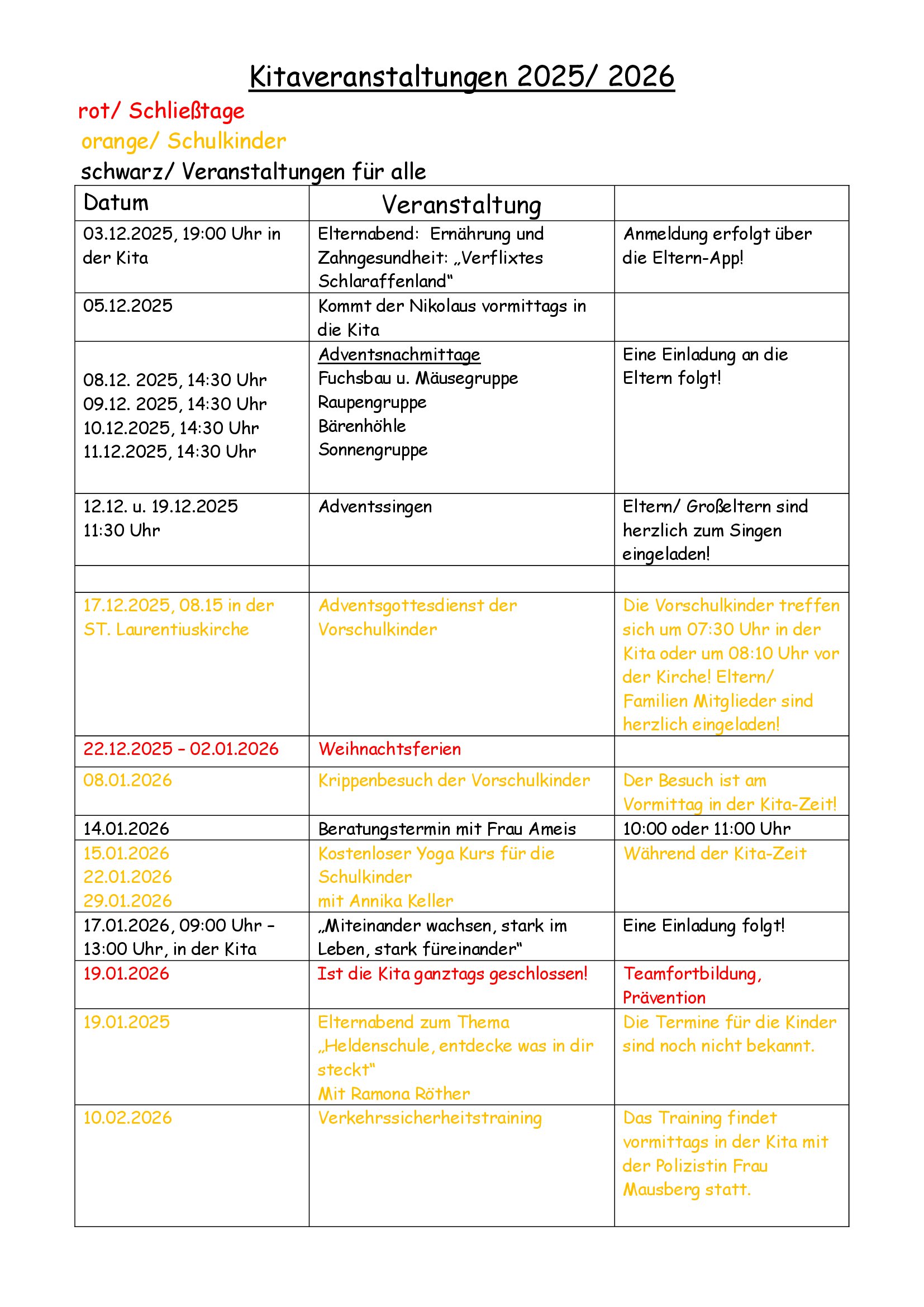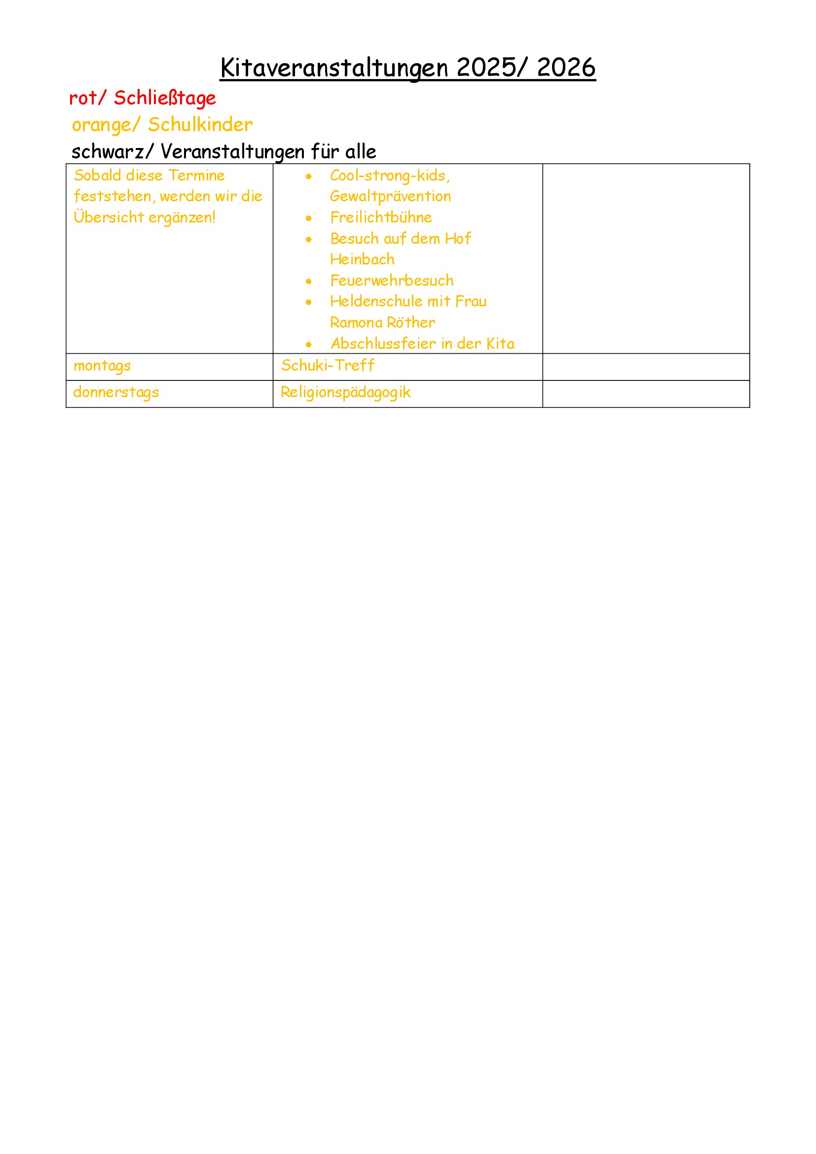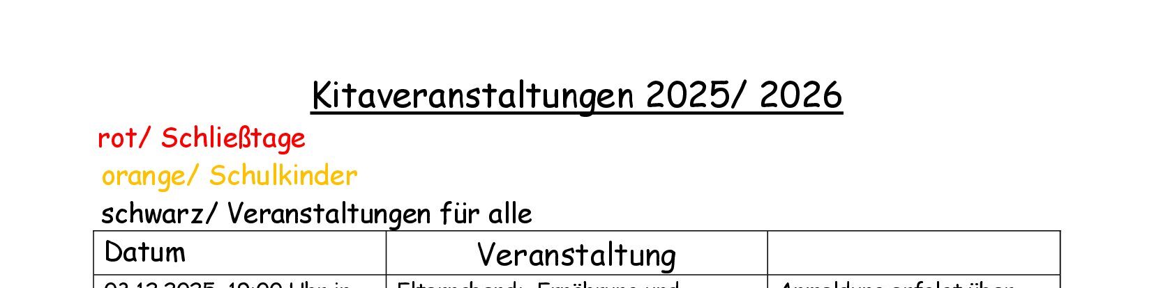 Rot/Schließtage orange/Schulkinder schwarz/Veranstaltungen für alle